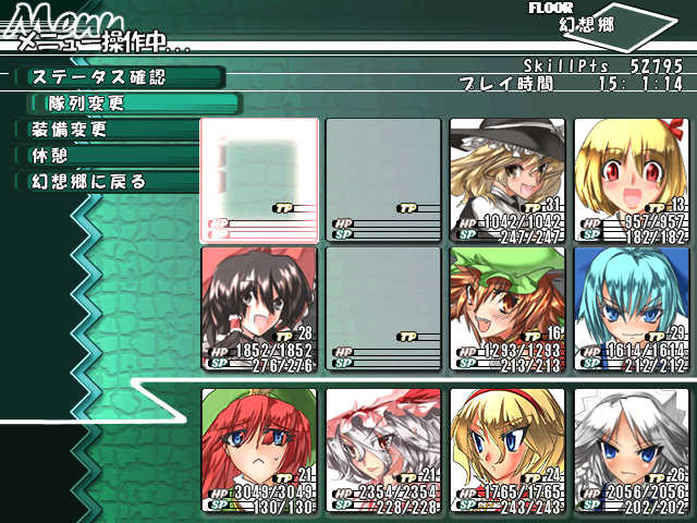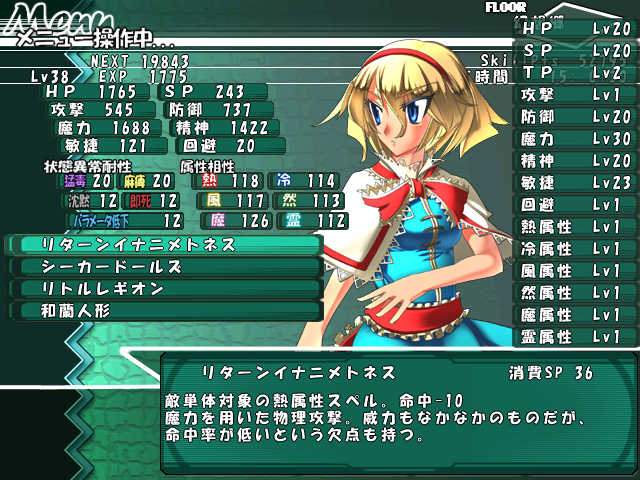 たまにはしっかりとツクってみようと思う。 というわけでここに制作日記記していきます。 午前三時半から三十分ごとに記録していく予定。 今日はどうせ暇なのでw PR うぉっしゃああああああああ!! 東方風神録のルナティックをクリアしました。 最初は針巫女で、次はコルマリです。 というかインフェルノマジでヤバい。強すぎ 当たり判定がちょこっとデカいなんて目じゃない。 道中が安全すぎる。特に三面以降。両側から来る敵の弾幕量が少ない 風神録がまだクリア出来てない人は試してみることオススメ。 というわけでリプレイうpします。 前方集中装備 魔法使い装備 それから、東方天闘技の第三体験版をうpしました。 今まで足りなかったものが色々実装されてます ダウンロードするならトップページからどうぞ。 ・・・・・・そろそろ専用ページ作るべきかなぁ(汗 web拍手お返事 >ウェブ拍手がないと聞いて土産を抱えてきました >(`・ω・´)っ『10800ぅにぅに』 (*´ω`)わぁいぅにぅにーだー! (*´ω`)バリバリムッシャムッシャ (*´ω`)・・・・・・ (*´ω`)久しぶりのぅにぅにーなのでちょっとずつ食べるよ! (*´ω`)残った分はとりあえず冷蔵庫に保存するよ! (*´ω`)つ[5400ぅにぅに] [冷蔵庫] 朝起きたら部屋の中にテントウムシが居ました。 とっても梅雨ですね。どうもろんさんです(何 というわけで、天子さんは何かを探しているようです。 その何かを見つけたとき、ラストバトルへの道が 開かれていきます。最終決戦は割と近い ところで、装備類を完全に実装しました。 妖精さんの道具屋で買うことが出来るようになります。 これを含んだ第三体験版を、近いうちに配布するかもしれません ~おまけ~ 東方の迷宮やってます。 7Fのボスを倒したのでレベル上げの真っ最中・・・・・・。 TPが妙に多いのはレベル上げ仕様だからです。うさみみバンド便利 5Fで一時間潜るとスキルポイントが大体25000ほど入りますが、 7Fを何度も往復した方が効率が良いかも? 溜まったスキルポイントは多分先に仲間になるであろう早苗さんに 全部注ぎ込む予定です。天子が先に仲間になったらそっちに。 どうやら私の三嫁(アリス、早苗、天子)も出るようです 二次嫁は全員平等に愛せるのが良いところ(ぇ そういえば外の世界の一夫多妻制も全ての妻を 平等に愛さなくてはいけないそうです。大変ですね そういう訳なので、予約した東方の迷宮を いまかいまかとwktkして待っています。 web拍手お返事 >「まだありません」の人、的中率すげぇw 彼は不思議な魔法を使っているようです |