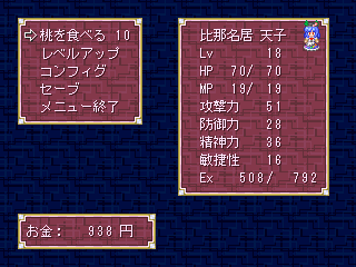 × [PR]上記の広告は3ヶ月以上新規記事投稿のないブログに表示されています。新しい記事を書く事で広告が消えます。 公開から四日ほど経ちましたが、 何人かの人に手に取ってもらえたようで嬉しいです。 遊び終わったら感想よろしくお願いしますm(_ _)m きっと面白いのでまだやってない人もどうぞー。 例大祭まで、来月分のVC発表まで、その他色々な暇潰しに最適ですよ(ぉ というわけで次回作の話。 そりゃあれだけ人形を爆破させてれば(ry 現在、第八話を製作中。 要石を差したのに何故か地震が止まらない幻想郷。 原因を突き止める為に、天子と早苗は一路博麗神社へと向かいます。 しかし神社で体調不良を訴え、天界に帰ってしまう天子。 ひとり残された早苗は紅魔館に戻ろうとするが・・・・・・ というわけで、今までとちょっと趣向を変えて シリアス気味にしてみようかと思います。 さすがに毎度同じ事してもしょうがないですし。 とりあえず鬱ENDは無いのでご安心をば。 web拍手お返事 >ウェブマネーが使えない・・だと・・・? >1475円分用意してると言うのにorz 訂正が間に合わなかったか・・・・・・ごめんなさいorz 会社によって使える電子マネーと使えない電子マネーがあるから困る。 PR というわけで、東方猫野山が無事公開されることになりました。 お近くのコンビニでビットキャッシュを買って、 それをとらのあなのサイト上で支払いすればプレイ出来るようになります。 ちなみにビットキャッシュの購入は大体の店で出来るそうですが 最低購入金額が950円と一番安く、かつ1円単位で購入できるらしい ファミリーマートで買うのが一番かと。 きっと面白いので是非遊んでやってくださいな あ、それと紹介文の一部が >このゲームをプレイするには、RPGツクール2000のRTPが必要です。 > >ファミ通HP >w こんなことになってますが、 自サイト以外の外部サイトのURLを貼ると こうなってしまうようです。あまり気にせずにー web拍手お返事 >とらのあなってwebマネー使えるの? >ビットキャッシュしか表示されてないような… そうだった/(^o^)\ 前回の記事は修正しておきました。ありがとうございますー >時遡本のボスを撃破した際のアイテムの入手条件は >スペカ無でに勝利すれば手に入ると見ていいのでしょうか? >プリズムリバーにスペカ無で勝利したのに手に入らなかったのです。 >もしかしたら他にも条件があるのでしょうか○ 時遡本のアイテムドロップは、序盤は一律25% 終盤は一律100%で特に条件を満たす必要はありませんぜ。 というわけスペルは遠慮なくバンバン使ってやってくださいw というわけで、とらのあなさんに東方猫野山の 登録申請をして置きました。通るかどうか心配です(ぇー 待ってくださる方も、 (web拍手で訂正もらいました。ありがとうございます) あまり心配してても仕方が無いので 新作を少しずつツクツクしてます。 今回のタイトルは東方天闘技。 その名の通りてんこちゃんこと比那名居 天子が主人公のRPGです。 メインメニュー画面はこんな感じ。 デフォメニューより少しだけすっきりしてるかも。 何故か早苗さんと一緒に幻想郷を練り歩きます。 その理由は体験版あたりで判明するかも と、まぁこんな感じです。 web拍手お返事 >潜伏てwなにをやらかしたんですかー!? >それはさておき公開が楽しみ 大人の事情があったのです。 決して電話代を払い忘れたわけじゃ(ry >潜伏w まあなんだ、がんばれ >復帰楽しみにしてるぜ 復帰したんだぜ!新作作ってるんだぜ! 猫野山のテストプレイに当てる時間が出来てよかった(ぉ >完成おめでとー! 公開までひと月待ってますー >さて、今やってるゲーム早く片付けないと! ありがとー!予定より早めの復帰です。 すぐに公開されるかはとらのあなさん次第・・・・・・!! >優永夜クリアしたんですよ~ けどウドンゲの防具が8のまま… >何処にあるか分からんとですマップは全部見たとです 一体どこなんだろう(ぉ ちなみに自分のデータだとちゃんとMAXになってます。 わかりにくい場所にあるのかもー? >東方猫野山製品版出るまでにレベル最大にするとか言ってたけど・・・ >44レベでギブアップorz レベル5までの雑魚戦でそこまで上げたのが恐ろしいw 自分が死にそうになるまで頑張っても30くらいが関の山 >おかえりなさいー >お帰りでござる ただいまなんだぜ! とりあえず帰ってきた報告だけをw やること多すぎて死にそうだorz web拍手お返事はもう少し待ってね(ぉ というわけでどうにか完成しました猫野山。 これからテストプレイ入ります。 これでバグが無ければ手続きとって公開・・・と行きたいところですが、 実はこれから一ヶ月 潜伏しなくてはいけないかもしれません。 旅行だのなんだので出費が重なって今月ヤバいヤバい。 そういうわけなので、潜伏期間が終ったら復帰します。 その間は、バグ取りしたり新作作ったりすることになるでしょう・・・orz あ、それに併せて体験版も更新しました。 戦闘アニメとタイトル画面、その他諸々